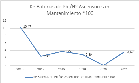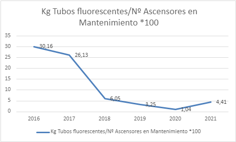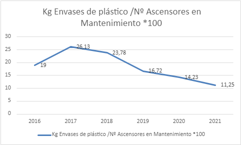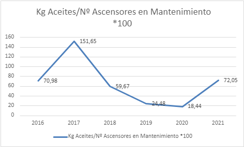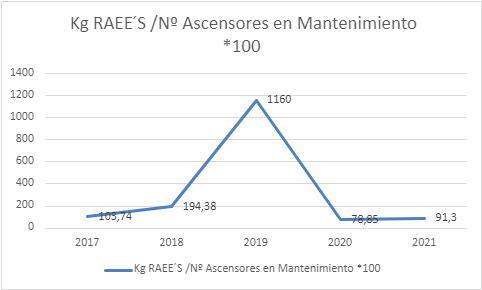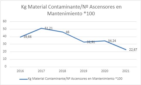 Este indicador está directamente relacionado con el número de ascensores en cartera y con la implicación del personal técnico en el reciclaje de residuos que cada vez es mayor. Durante el año 2021 se han obtenido datos similares a la prepandemia.