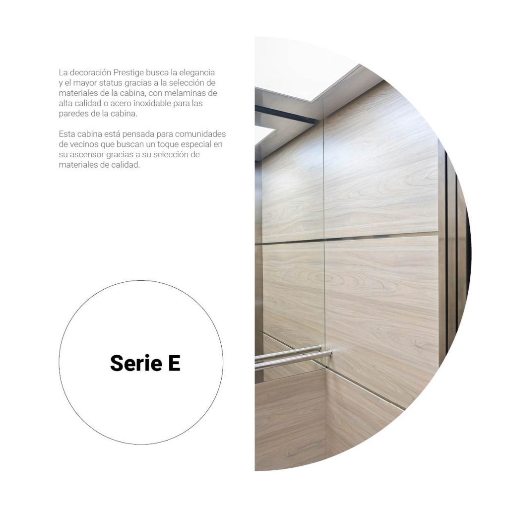 La decoración Serie E busca la elegancia y el mayor status gracias a la selección de materiales de la cabina, con melaminas de alta calidad o acero inoxidable para las paredes de la cabina.