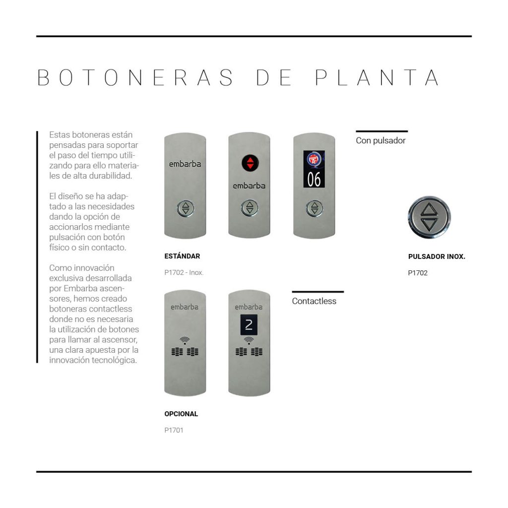 Estas botoneras están pensadas para soportar el paso del tiempo utilizando para ello materiales de alta durabilidad. El diseño se ha adaptado a las necesidades dando la opción de accionarlos mediante pulsación con botón físico o sin contacto. Como innovación exclusiva desarrollada por Embarba ascensores, hemos creado botoneras contactless donde no es necesaria la utilización de botones para llamar al ascensor, una clara apuesta por la innovación tecnológica
