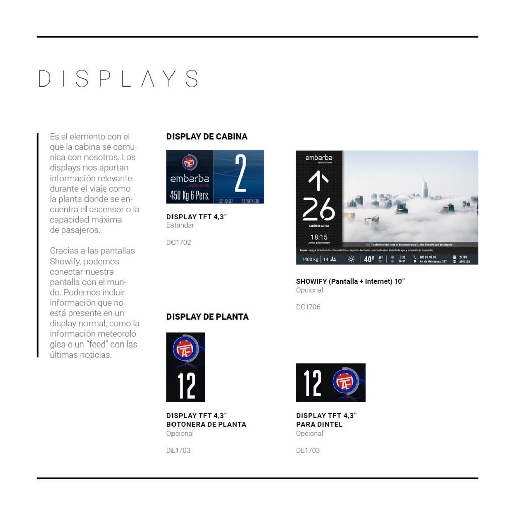 Es el elemento con el que la cabina se comunica con nosotros. Los displays nos aportan información relevante durante el viaje como la planta donde se encuentra el ascensor o la capacidad máxima de pasajeros. Gracias a las pantallas Showify, podemos conectar nuestra pantalla con el mundo. Podemos incluir información que no está presente en un display normal, como la información meteorológica o un “feed” con las últimas noticias.