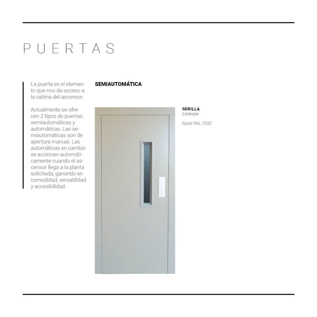 La puerta es el elemento que nos da acceso a la cabina del ascensor. Actualmente se ofrecen 2 tipos de puertas,