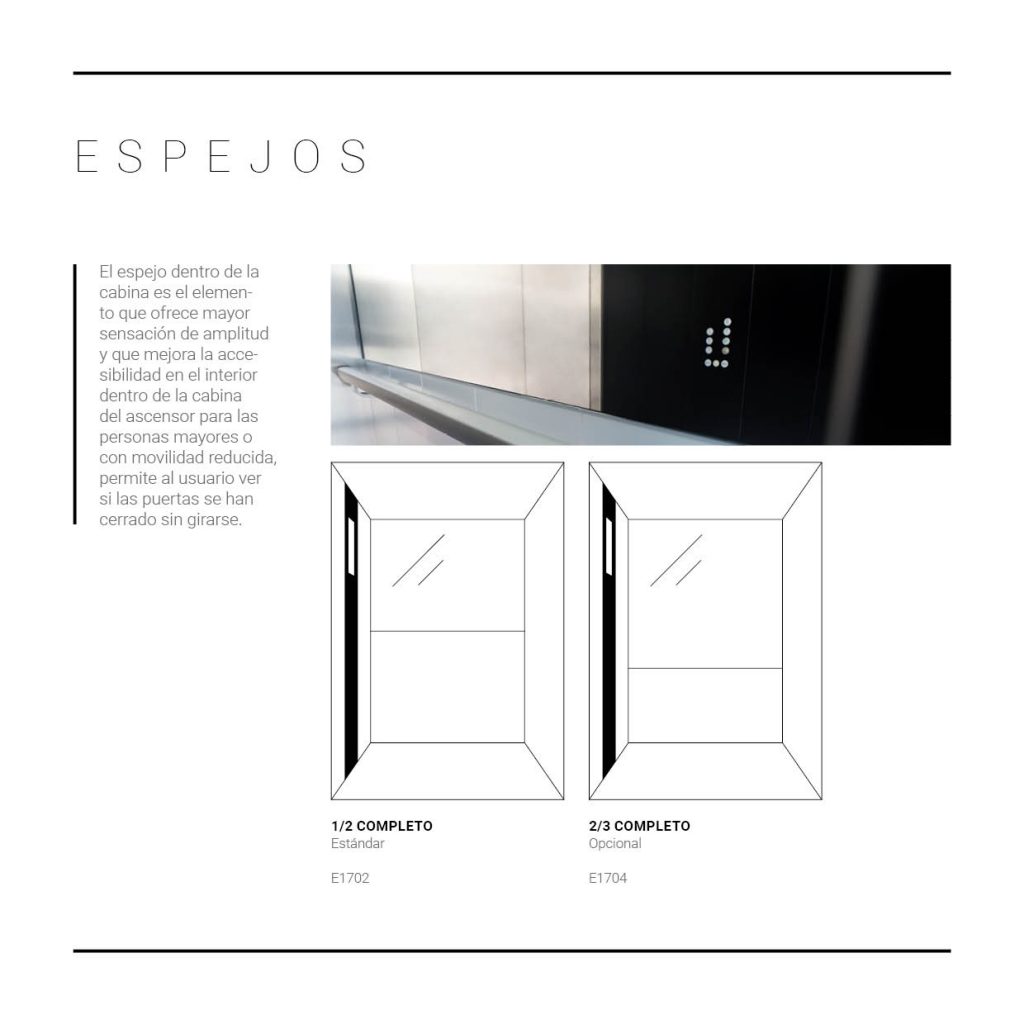 El espejo dentro de la cabina es el elemento que ofrece mayor sensación de amplitud y que mejora la accesibilidad en el interior dentro de la cabina del ascensor para las personas mayores o con movilidad reducida, permite al usuario ver si las puertas se han cerrado sin girarse.