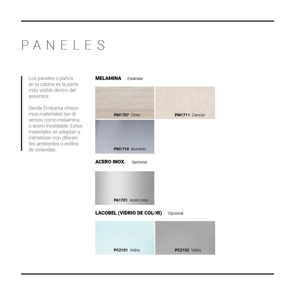 Los paneles o paños en la cabina es la parte más visible dentro del ascensor. Desde Embarba ofrecemos materiales tan diversos como melamina o acero inoxidable. Estos materiales se adaptan y mimetizan con diferentes ambientes o estilos de viviendas.