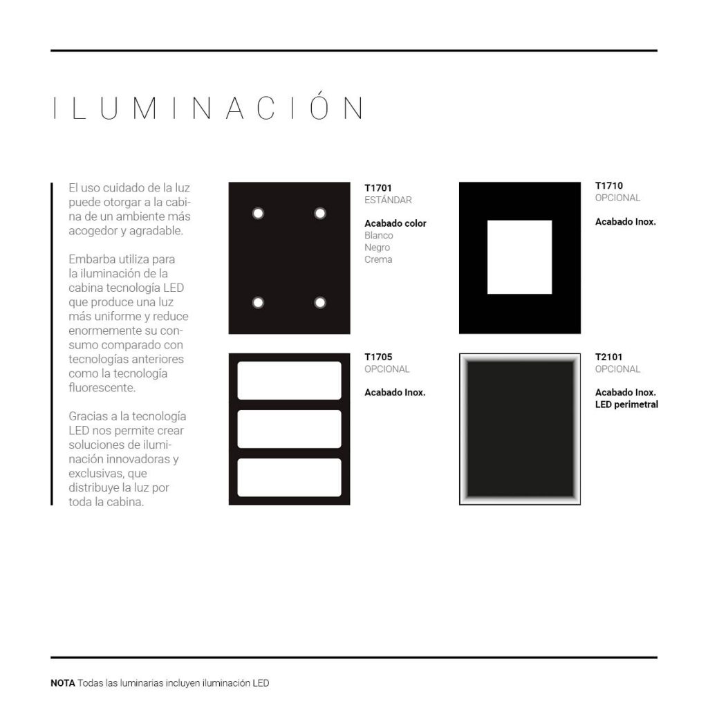 la iluminación de la cabina tecnología LED que produce una luz más uniforme y reduce enormemente su consumo comparado con tecnologías anteriores como la tecnología fluorescente. Gracias a la tecnología LED nos permite crear