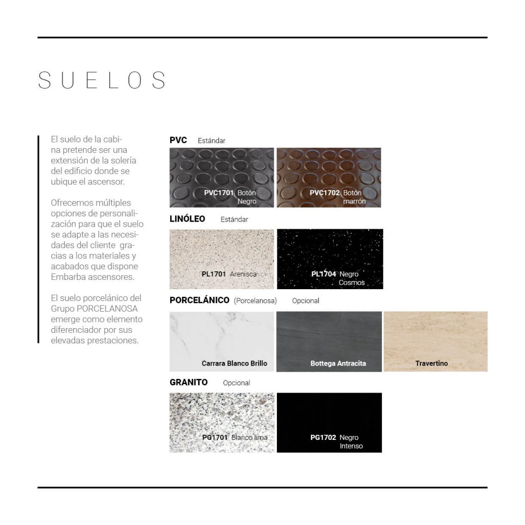 El suelo de la cabina pretende ser una extensión de la solería del edificio donde se ubique el ascensor. Ofrecemos múltiples opciones de personalización para que el suelo se adapte a las necesidades del cliente gracias a los materiales y acabados que dispone Embarba ascensores. El suelo porcelánico del Grupo PORCELANOSA emerge como elemento diferenciador por sus elevadas prestaciones.