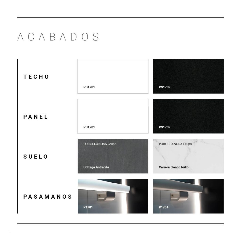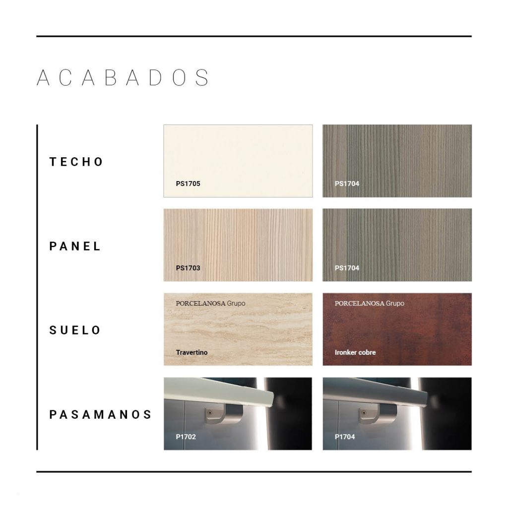 En cabina, se han mantenido elementos como los paneles, siguiendo con la misma gama de colores, pero se han actualizado la gama de suelos. Seguimos utilizando suelos porcelánicos de Porcelanosa grupo pero hemos actualizado su gama, incorporando los modelos Bottega Antracita y el Travertino, que mejoran la habitabilidad en cabina y enfatiza en las características de cada cabina. El Bottega Antracita aporta elegancia y solidez, el Travertino en cambio calidez y robustez a la gama, también damos continuidad al Carrara blanco brillo y al Ironker cobre.